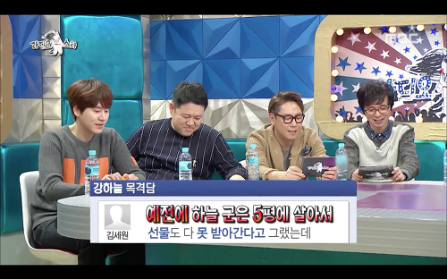 꽃보다 청춘에서 예의바른 막내로 예능에 발을 들였던 강하늘이 처음으로 예능 전쟁터 라디오스타에 출연했다. 정보력이 가장 뛰어난 작가를 보유한 라디오스타의 출연한다는건 숨겨진 사생활들을 예고없이 물어보기도 하는데 이전에 늘 고생했던 출연자들과는 상반된 이야기가 나왔다.