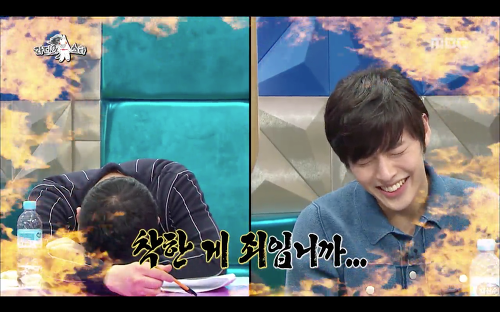 꽃보다 청춘을 본 사람들은 예상가능한 모습이었을지도 모르지만 예능타짜들은 그의 착함을 예능으로 승화시키며 그의 장점인 착함과 예의바름을 유쾌한 웃음으로 덧입혀주는데 성공했다. 간만에 착한 방송을 표방한 라디오스타의 최대 수혜자 강하늘! 영화홍보차 나왔다가 본인 홍보 실컷 하고 가는 모습이다. 영화 "동주"의 캐스팅도 유아인과 경쟁했다는 이야기도 했는데 유아인보다는 강하늘이 더 어울린다고 느껴진다. 유아인의 연기력이 문제가 아닌 이미지에서 강하늘이 윤동주의 감성과 더 닮은 것 같다는 느낌이다. 암튼 그의 착함이 연기에서도 쭈~~욱 펼쳐지길 기대해본다.