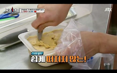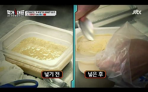 하지만 연장전에서도 재료들은 제대로 내어주지 않고 초콜릿을 주제로 한 요리 베이스를 미리 만들어 놓은 꼼수까지 카메라에 걸린다. 더 웃긴건 너무 얼려서 지도 허둥지둥 해 대는 셰프꼴이란 ㅋㅋㅋ 어이가 없다. 나중에 카메라에 찍히기도 했고 양의 차이도 눈에 띈다. 선 밑으로 양이 얼마없던 우유와 초콜릿을 섞은 것이 곱빼기가 되어 등장하는 것만 봐도 알 수 있다. 그리고 단 7분만에 꽝꽝 얼려지는 신기한 광경도 봤다.