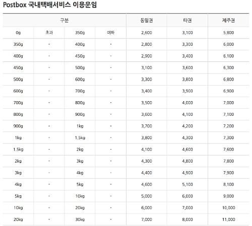마지막으로 택배요금은 아래와 같다. 무게에 따라 다르며 도서산간지역과 제주도 지역은 운임이 다름을 알 수 있다. 선불이 아닌 착불은 300원이 더 비싸기 때문에 택배배송은 선불이 500원 더 저렴하게 이용할 수 있다.